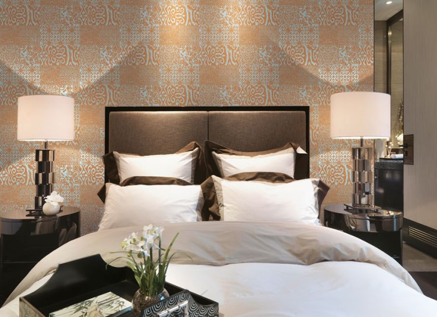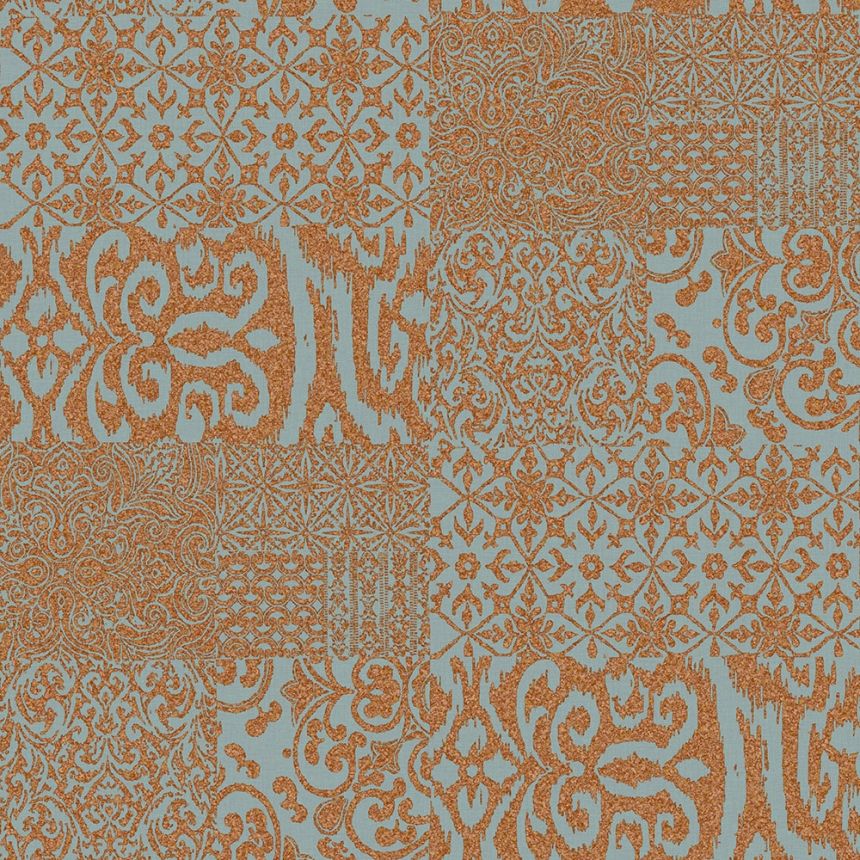 Smooth metallic background in a menthol color, metallic embossed pattern in terracotta shades.